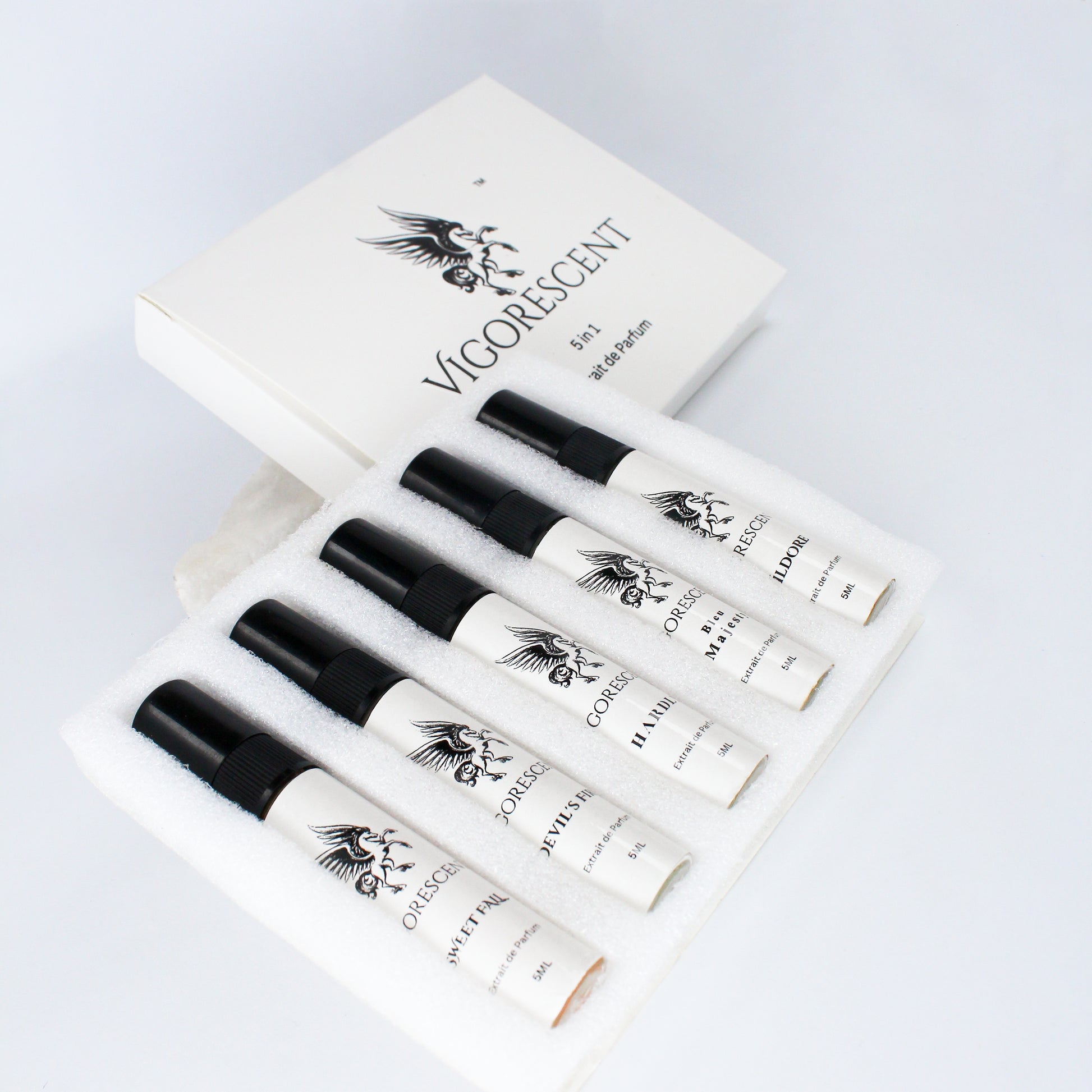 Step into luxury with a curated set of five premium 5ml fragrances, chosen from Vigorescent’s exclusive collection.